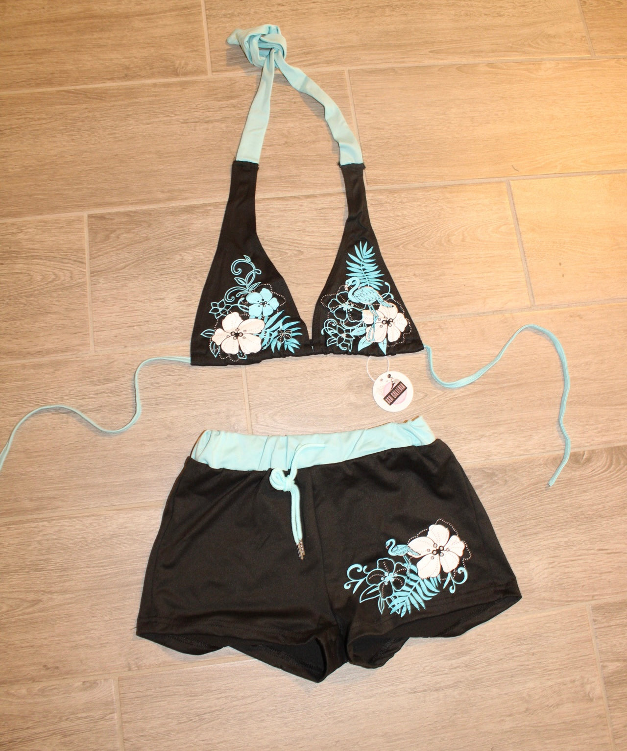 (Black base with color accents on the flowers, waistband, and bikini top tie)